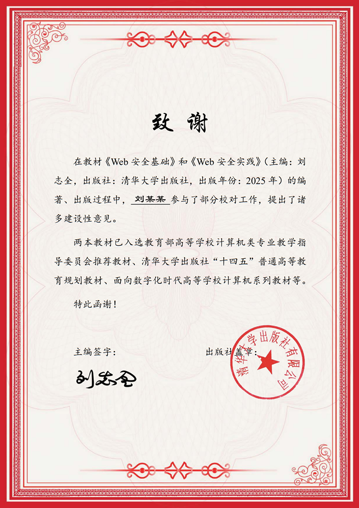 如有意见或建议,请发邮件至:websecbook@foxmail.com,我们将不胜感激,并在下一版本中进行完善。此外,反馈有效意见或建议的读者将获得由教材主编和清华大学出版社联合签发的"致谢"电子证书(如下所示)。